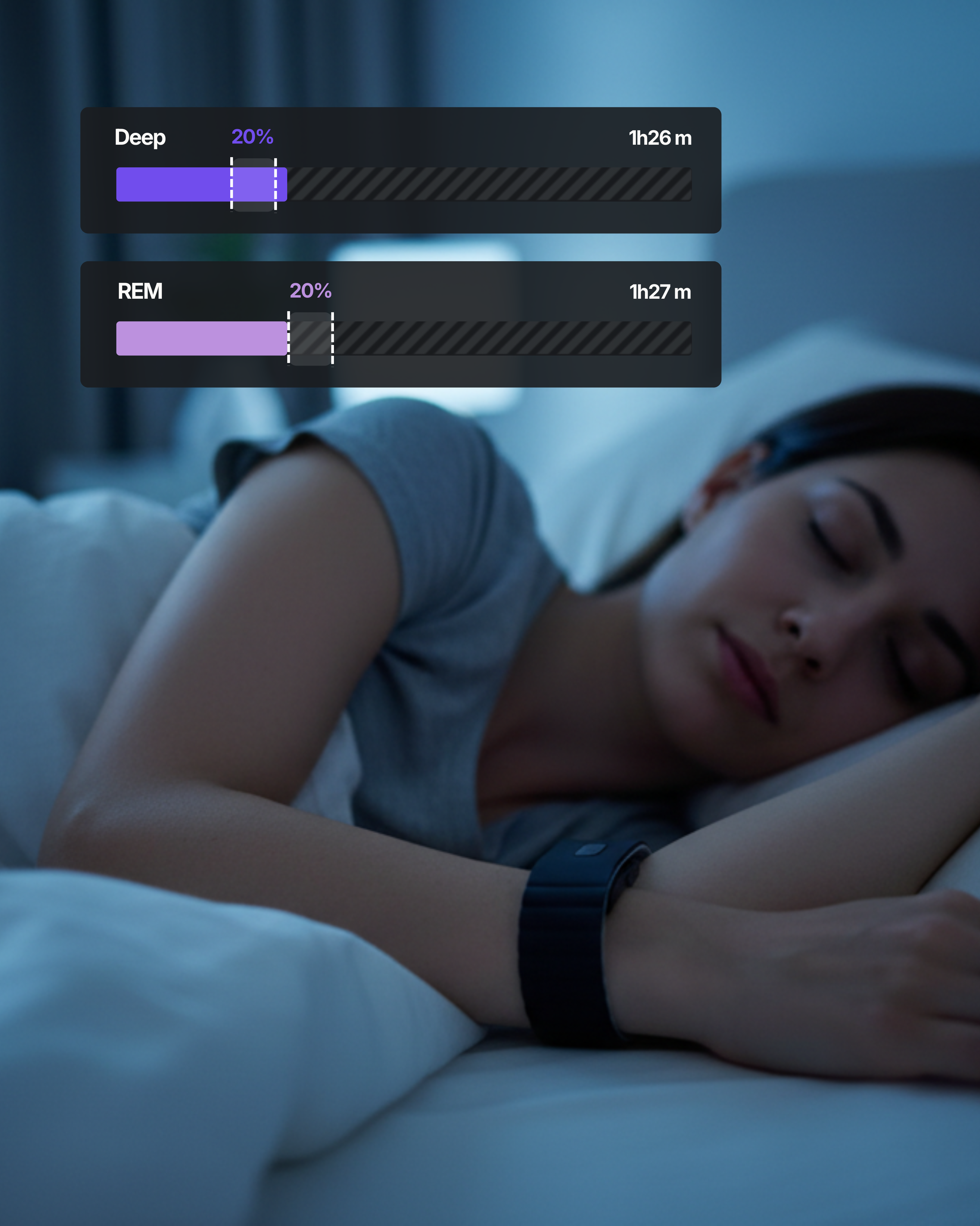 ✓ Score de sommeil (0-100) basé sur durée, efficacité et phases